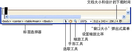 標(biāo)簽選擇器顯示環(huán)繞當(dāng)前選定內(nèi)容的標(biāo)簽的層次結(jié)構(gòu)。單擊該層次結(jié)構(gòu)中的任何標(biāo)簽以選擇該標(biāo)簽及其全部?jī)?nèi)容。單擊 可以選擇文檔的整個(gè)正文。若要設(shè)置標(biāo)簽選擇器中某個(gè)標(biāo)簽的 class 或 id 屬性,請(qǐng)右鍵單擊 (Windows) 或按住 Control 鍵并單擊 (Macintosh) 該標(biāo)簽,然后從上下文菜單中選擇一個(gè)類(lèi)或 ID。標(biāo)簽選擇器是選擇標(biāo)簽的首選方法,因?yàn)樗梢源_保您始終準(zhǔn)確地選擇標(biāo)簽。手形工具使您可以單擊文檔并將其拖入"文檔"窗口。單擊"選擇"工具可禁用手形工具。"縮放"工具和"設(shè)置縮放比率"彈出式菜單可以讓您為文檔設(shè)置縮放比率。"窗口大小"彈出式菜單(僅在"設(shè)計(jì)"視圖中可見(jiàn))用來(lái)將"文檔"窗口的大小調(diào)整到預(yù)定義或自定義的尺寸。"窗口大出式菜單的右側(cè)是頁(yè)面(包括全部相關(guān)的文件,如圖像和其它媒體文件)的文檔大小和估計(jì)下載時(shí)間。