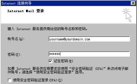 yourname@yourdomain.com;為了確保安全,密碼顯示為星號。如果您沒有輸入密碼或輸入密碼有誤,系統(tǒng)會在接收郵件時提示您輸入密碼。