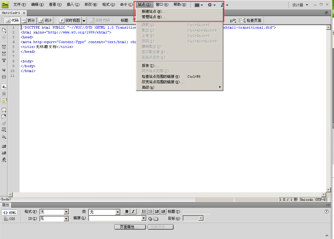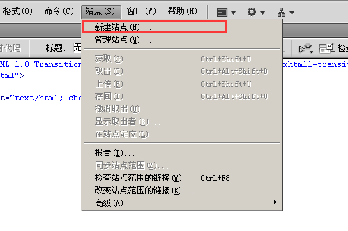 新建HTML之后,我們找到菜單里“站點”一欄,點擊之后,下拉菜單出現“新建站點”和“管理站點”,如下圖所示:
